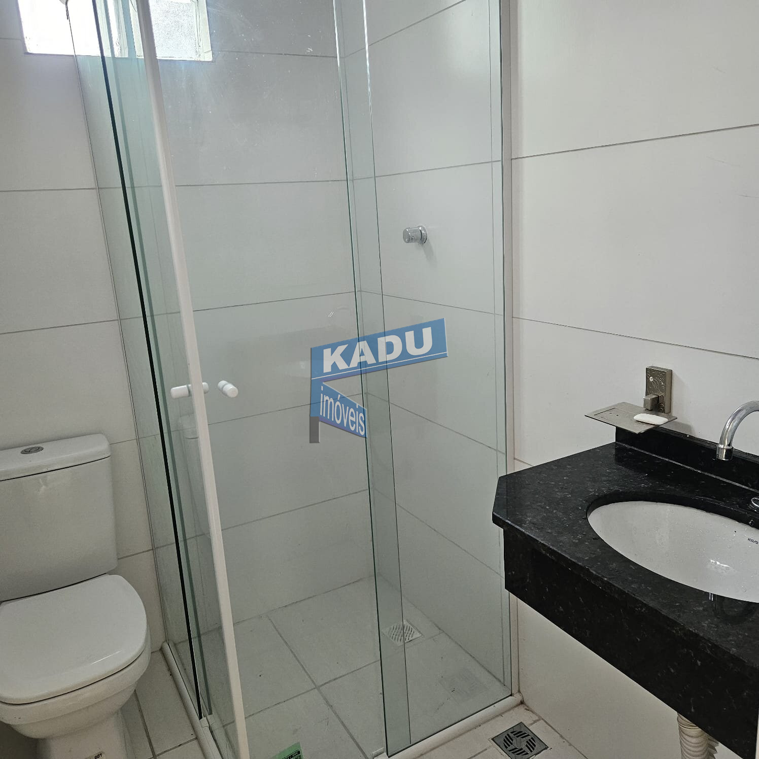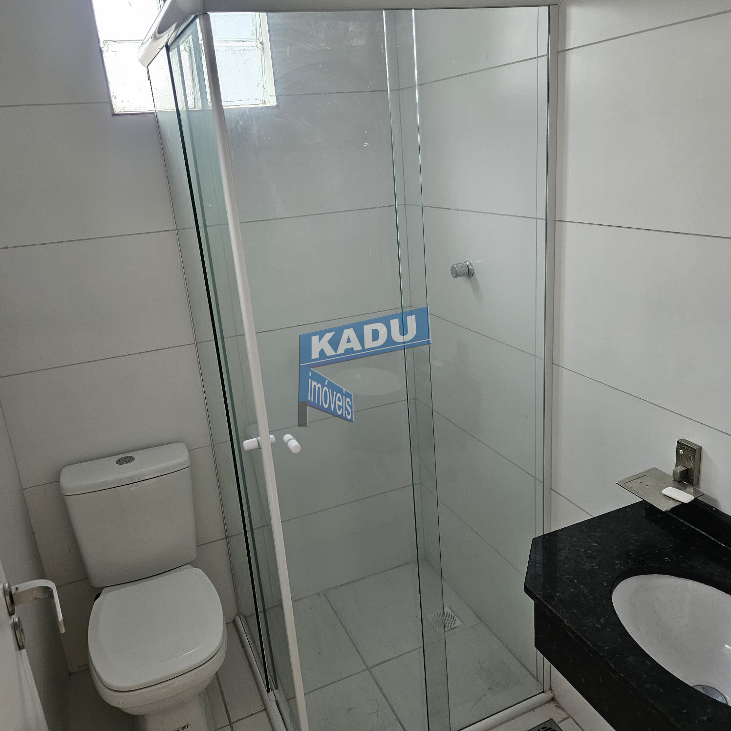 1 banheiro social com tampo em granito e box de vidro